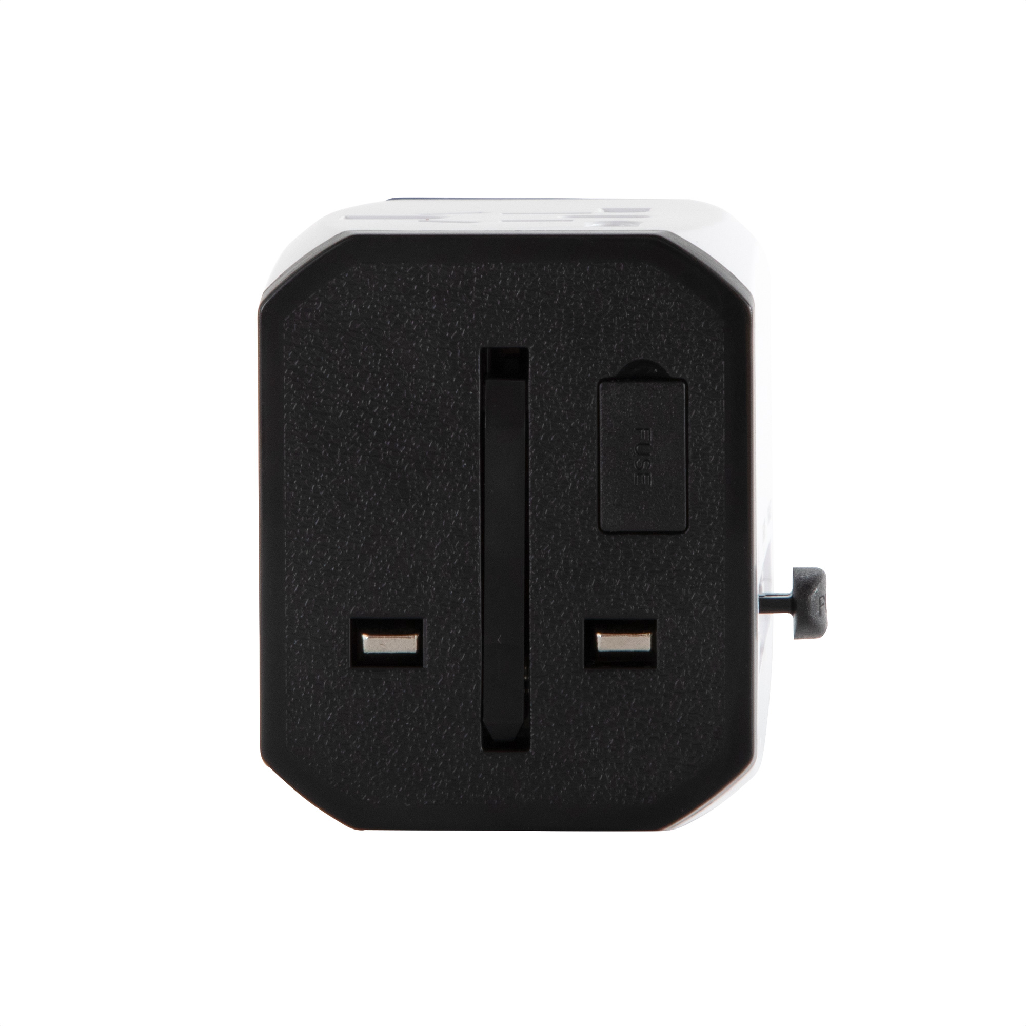 Adaptador universal de viaje. Tres enchufes: dos de la Unión Europea y uno del Reino Unido. Tipo de patas: redondas, cruzadas y paralelas. Toma múltiple. Puertos USB y USB C. Potencia: 100-250V, 6A MAX. Salida total usb: 5V/2.4A máximo por puerto.