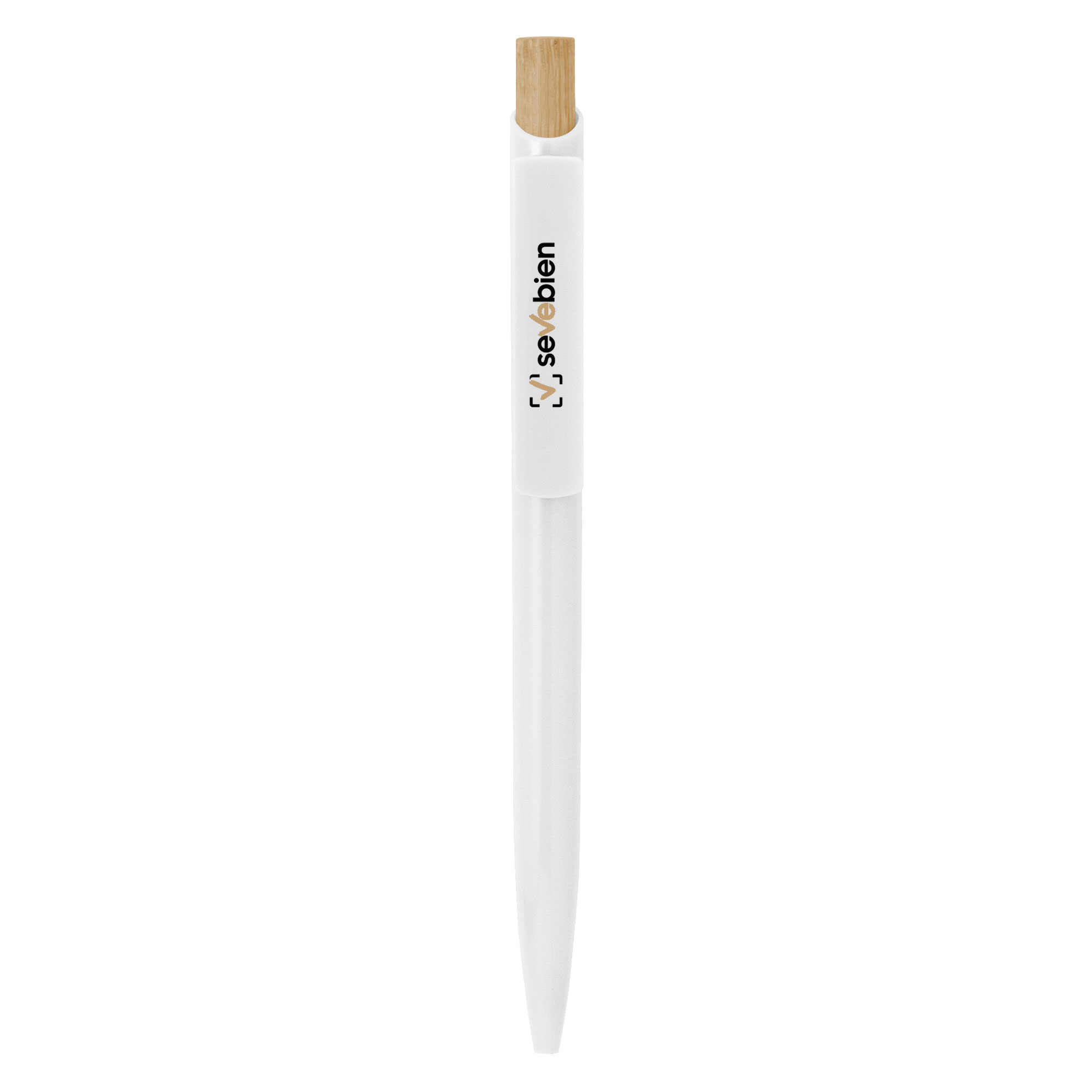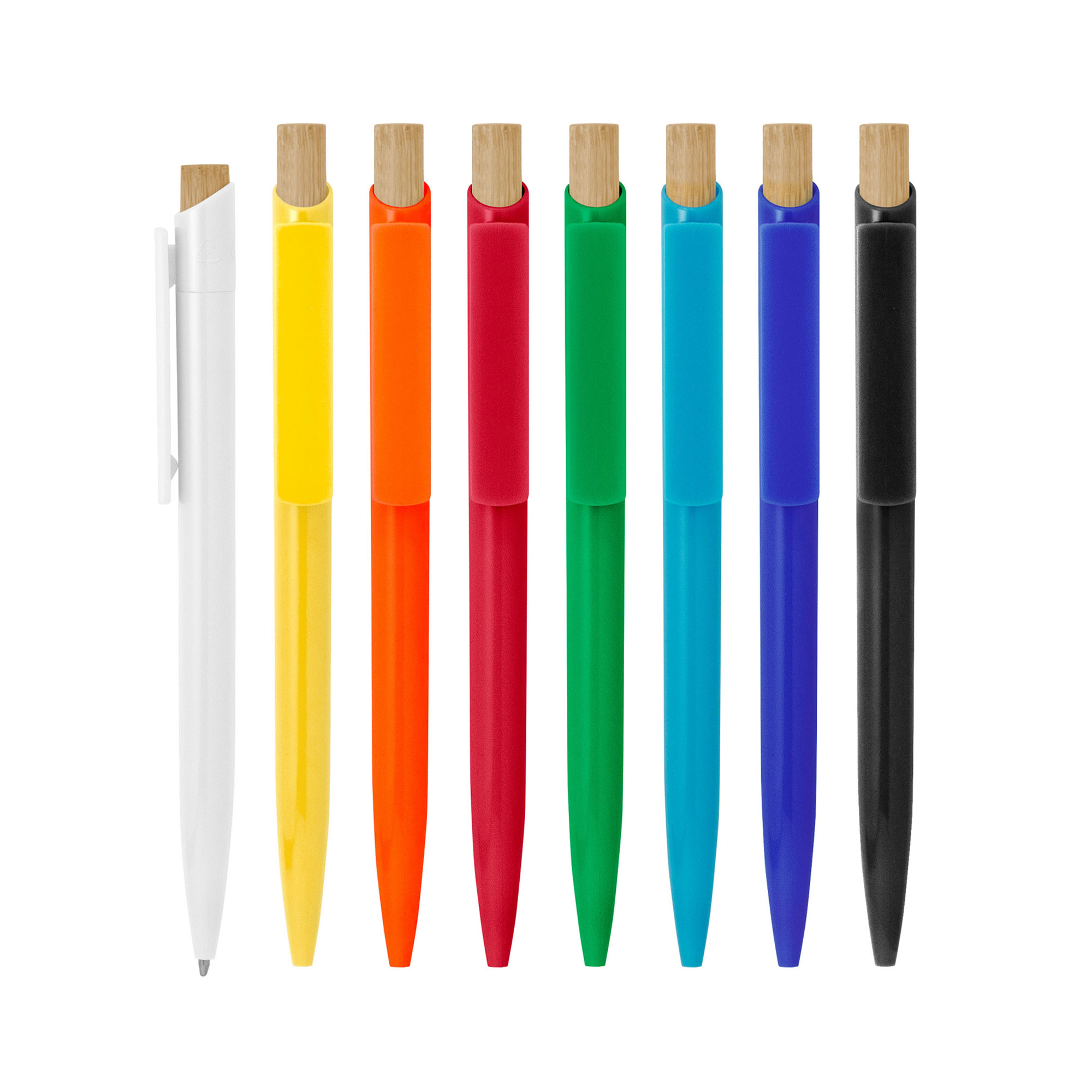 Bolígrafo retráctil. Cuerpo de diferentes colores. Pulsador de bambú. Clip del mismo color del cuerpo.