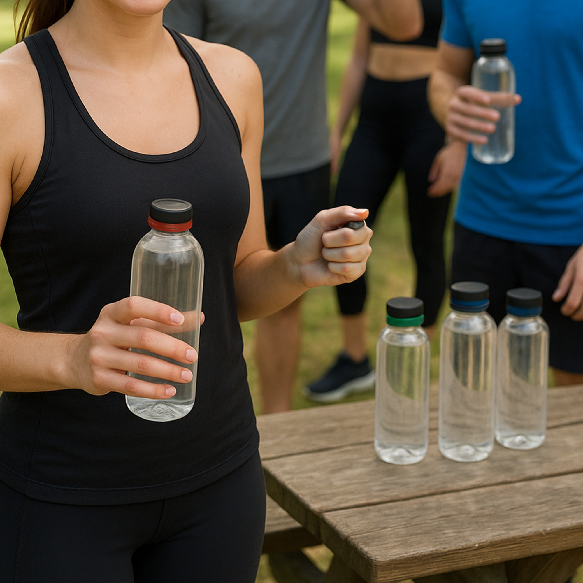 Botella de plástico transparente con tapa a rosca color negro mate con anillo de silicona de diferentes colores.