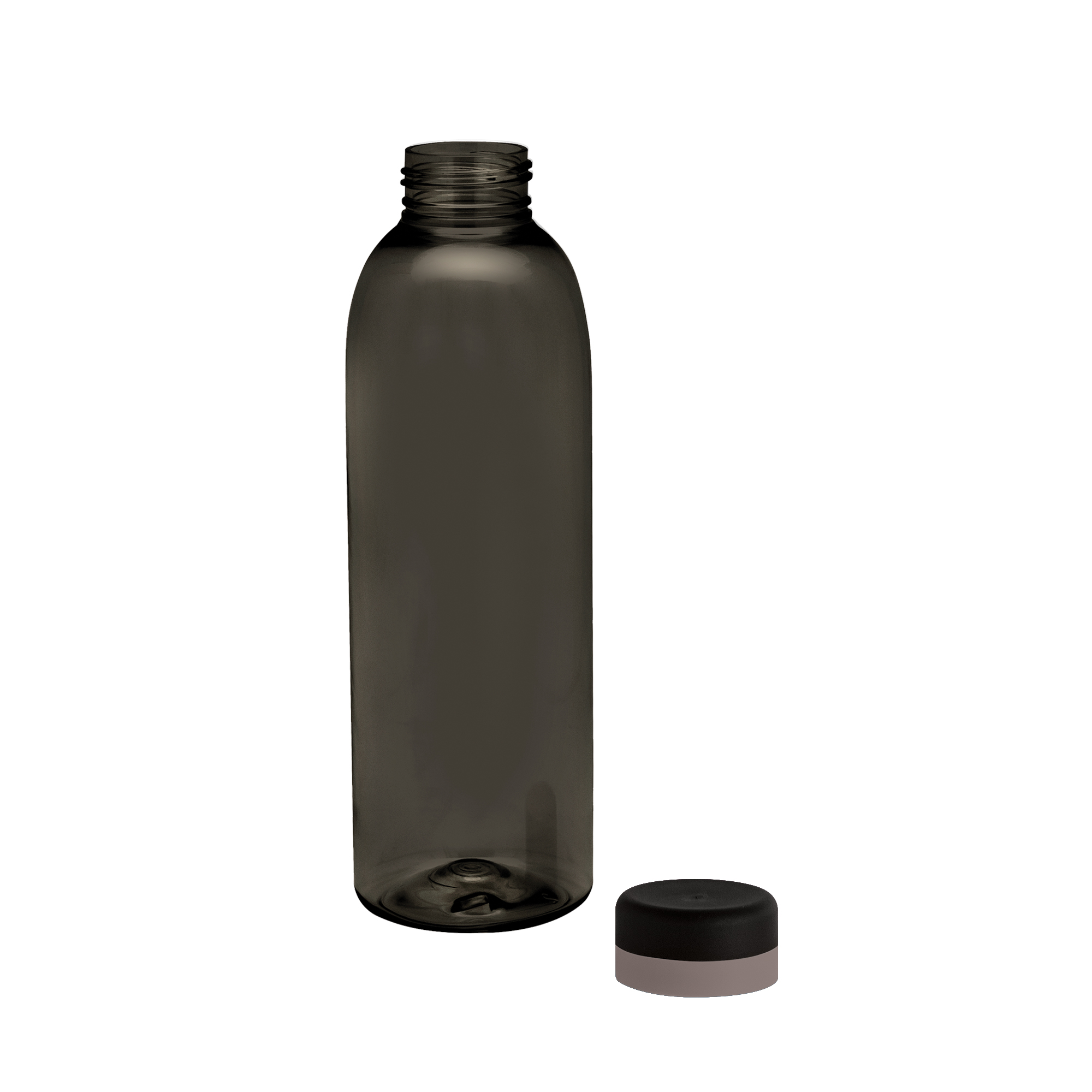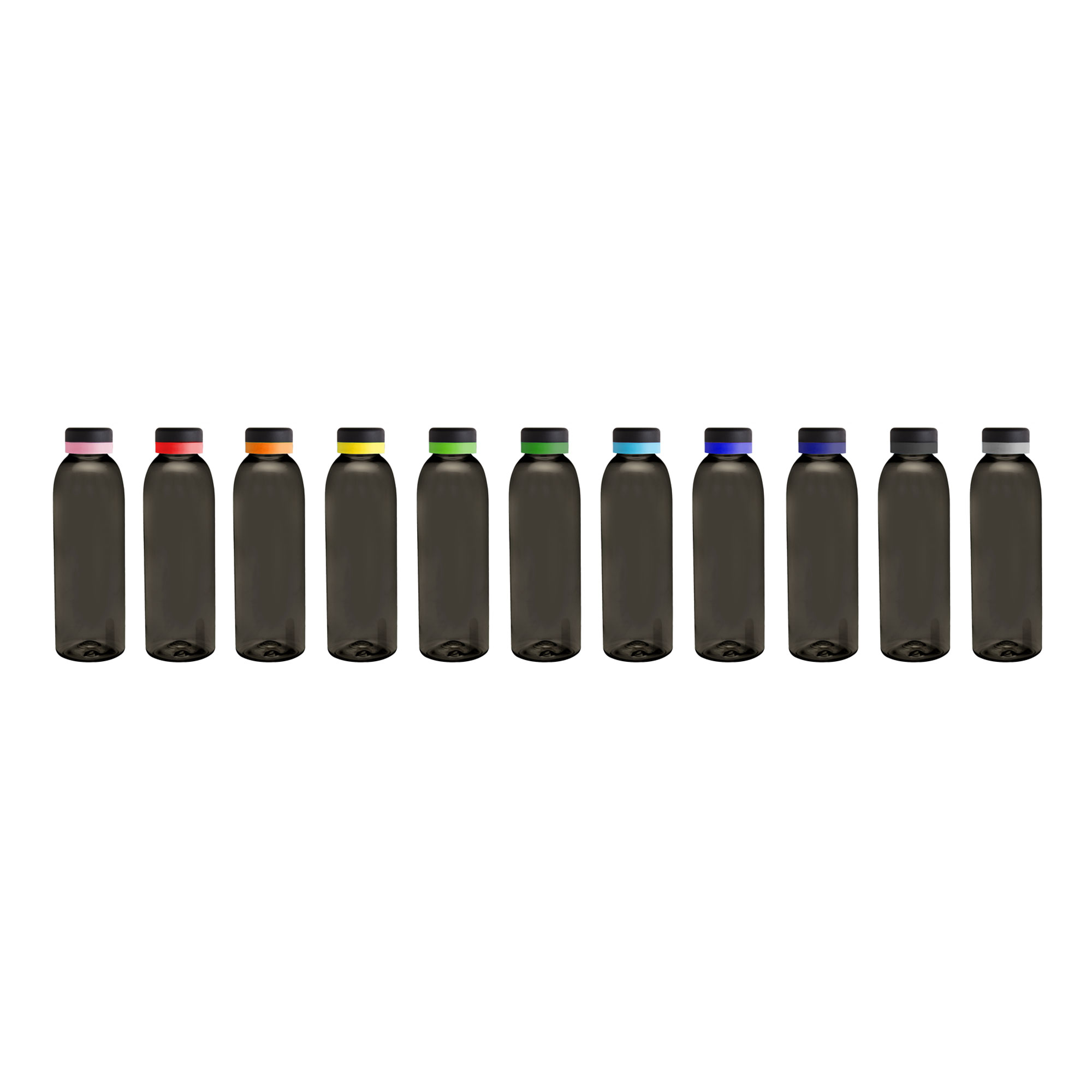 Botella de plástico de color negro translúcido con tapa a rosca color negro mate con anillo de silicona de diferentes colores.