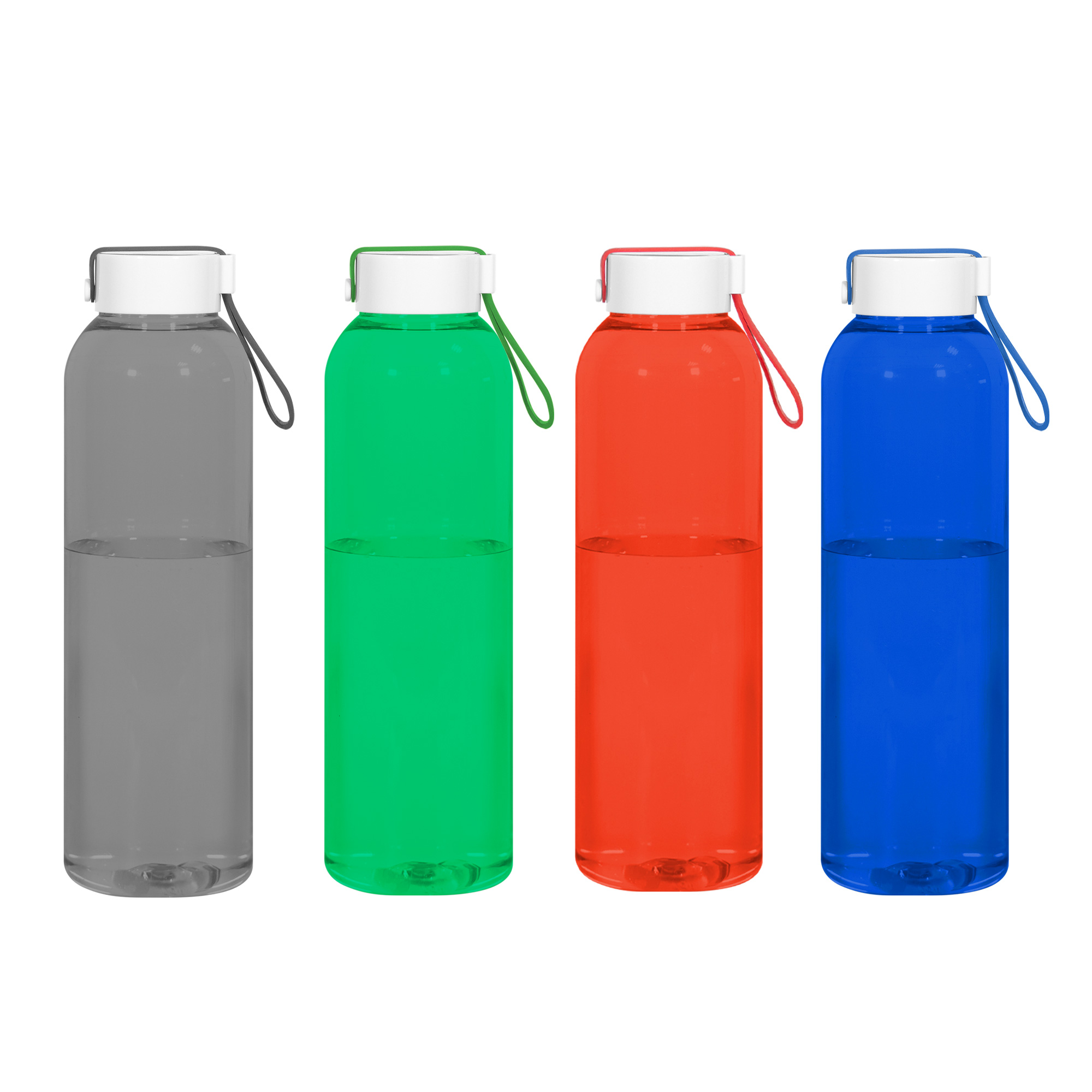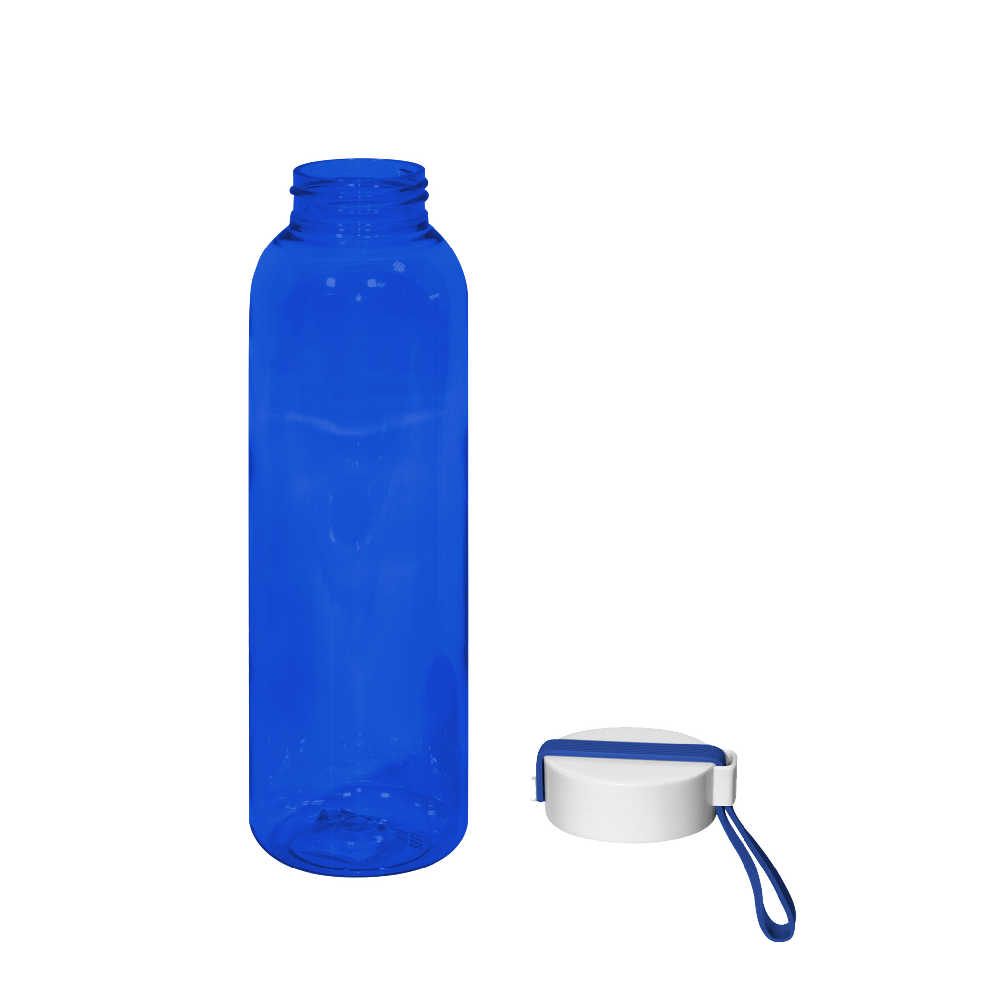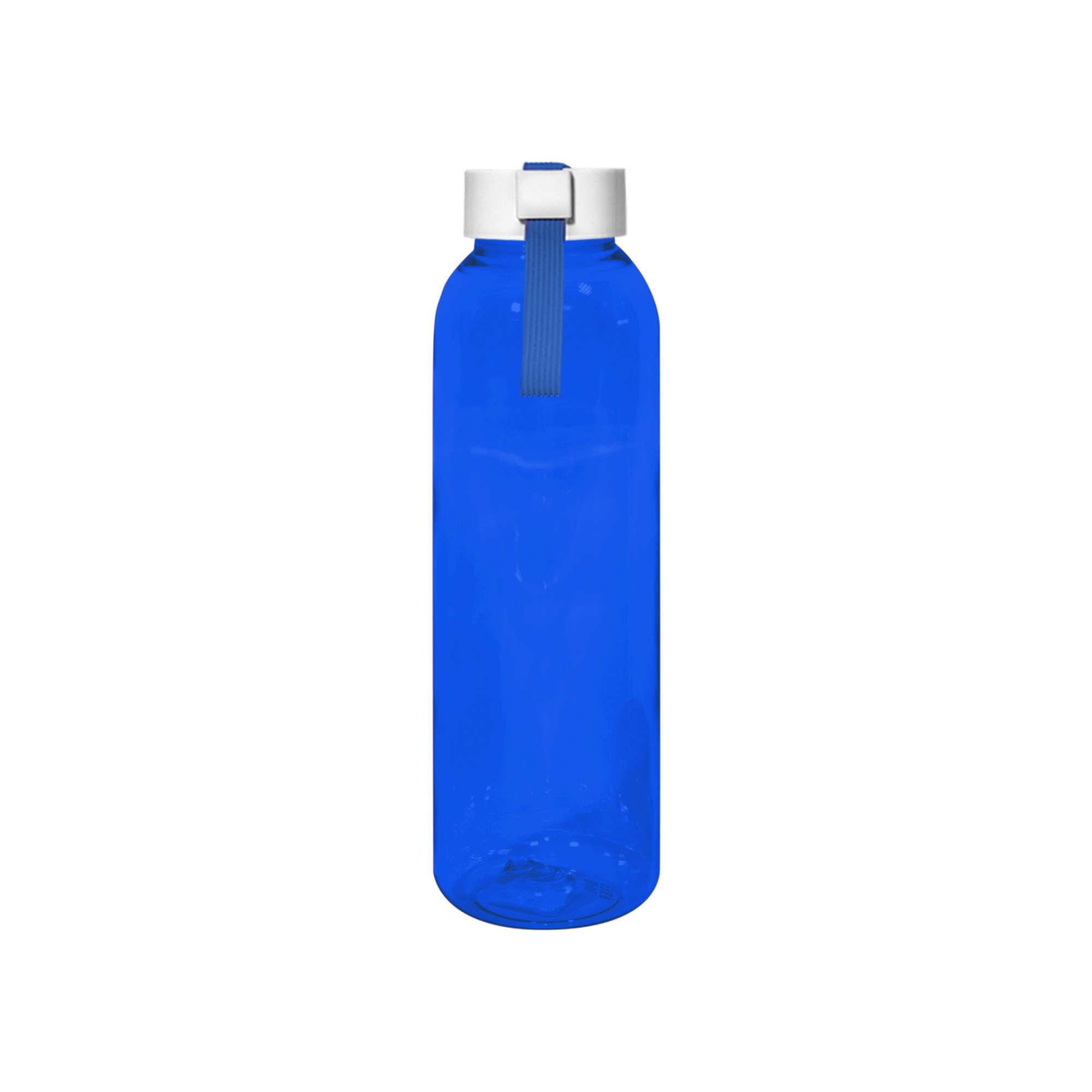 Botella de color translúcido con tapa a rosca plástica de color blanco con correa de silicona del mismo color de la botella.