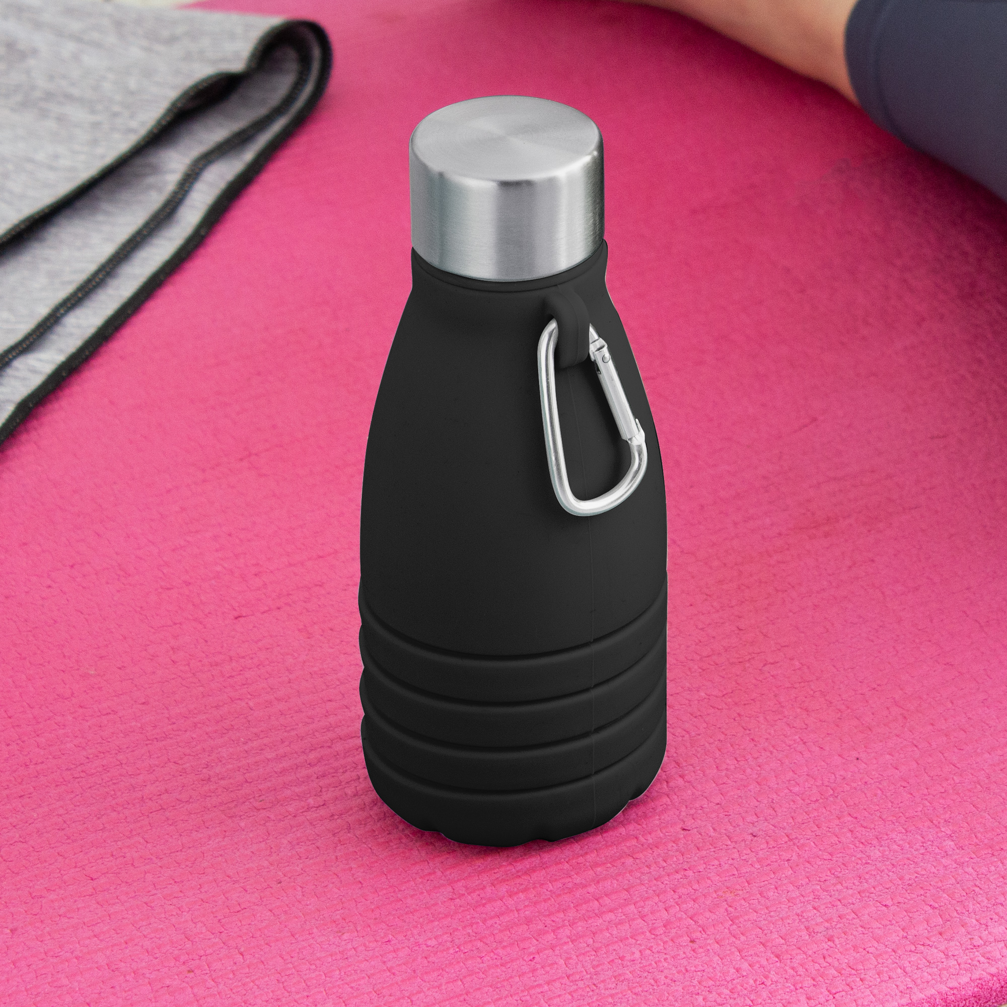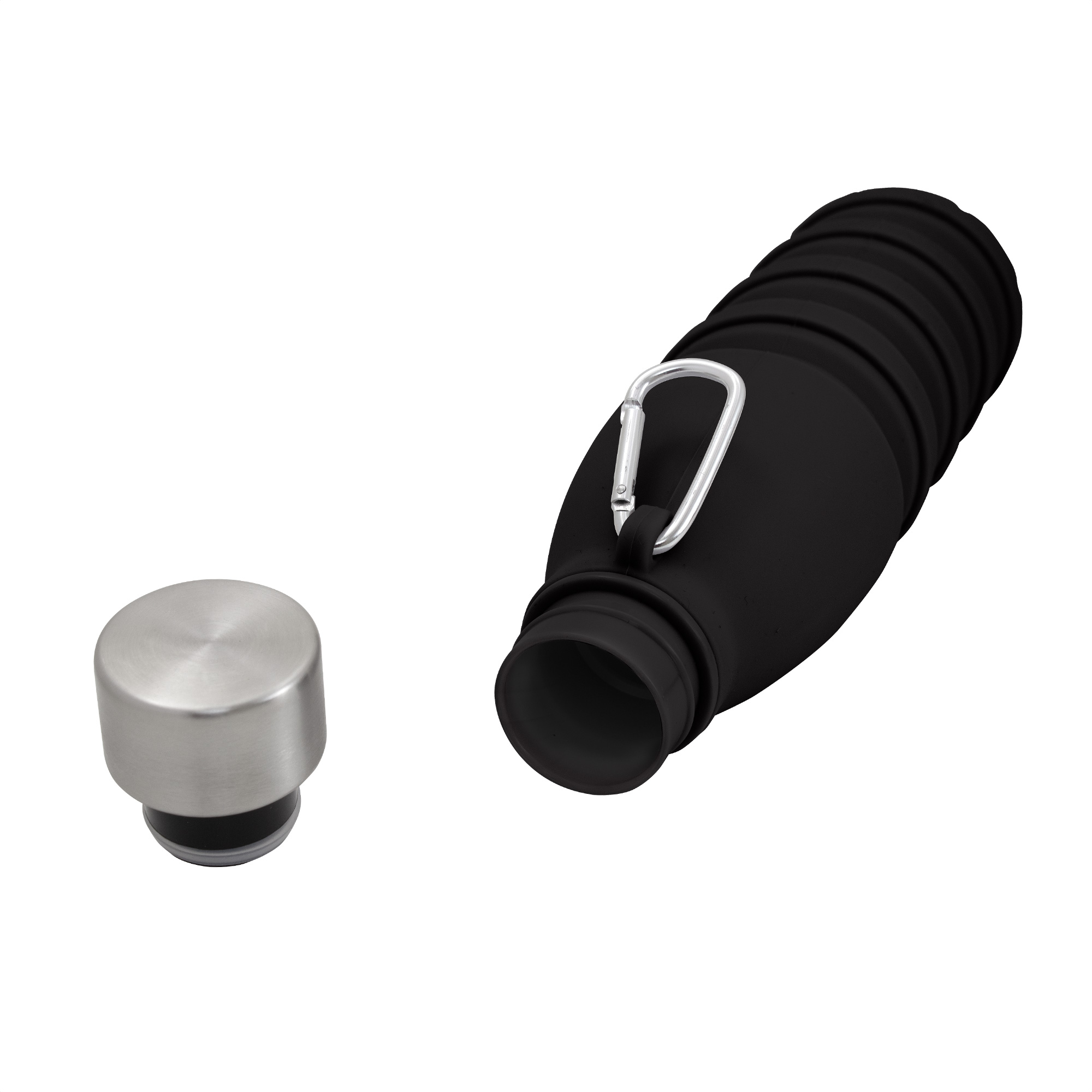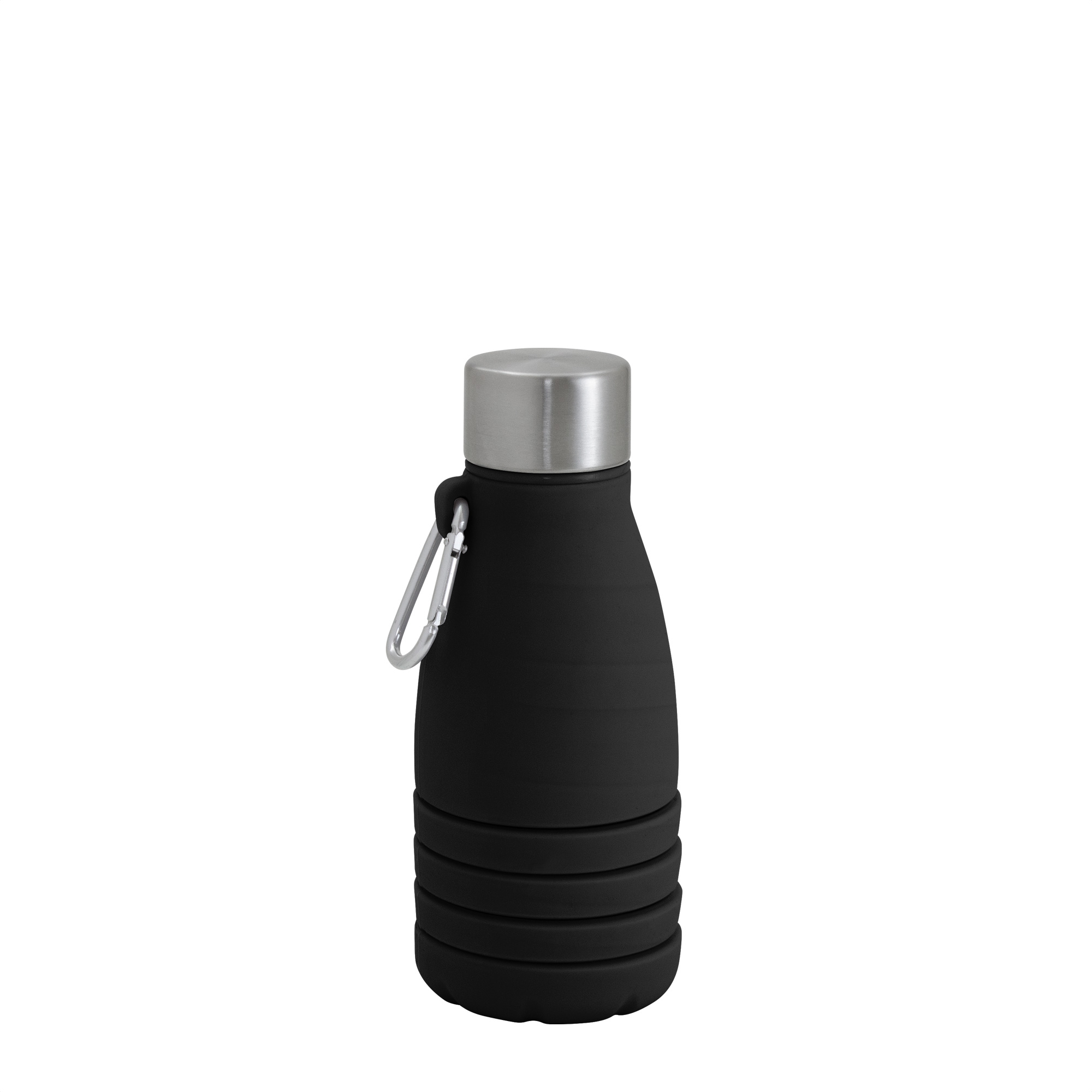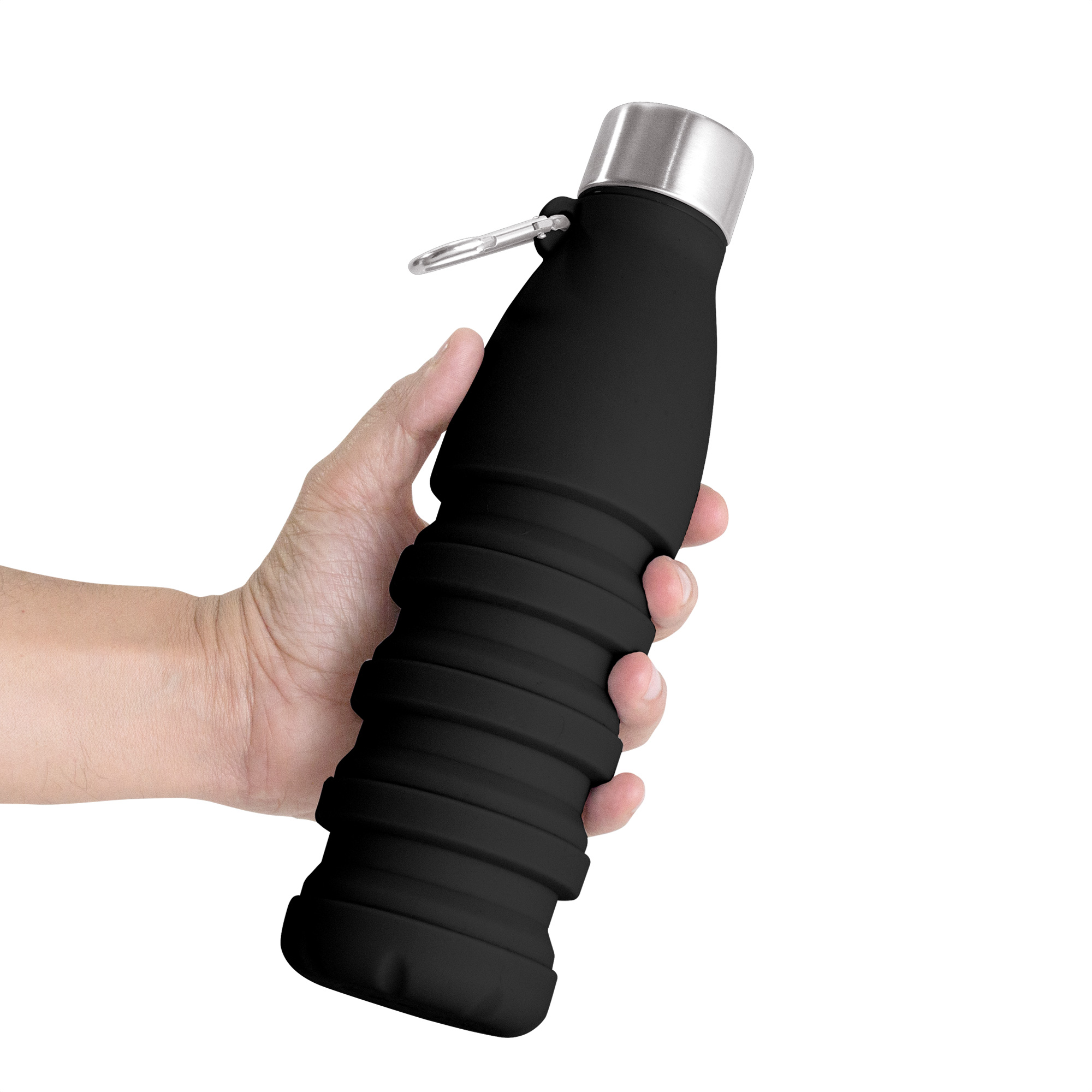 Botella plegable que reduce su tamaño a 17 cm cuando está vacía, ocupando un mínimo espacio en tu mochila o bolso. Boca de botella plástica. Tapa de acero inoxidable 201 y mosquetón de aluminio plateado. Para ajustar el tamaño de la botella, simplemente retira la tapa y ajusta la altura según tus necesidades.