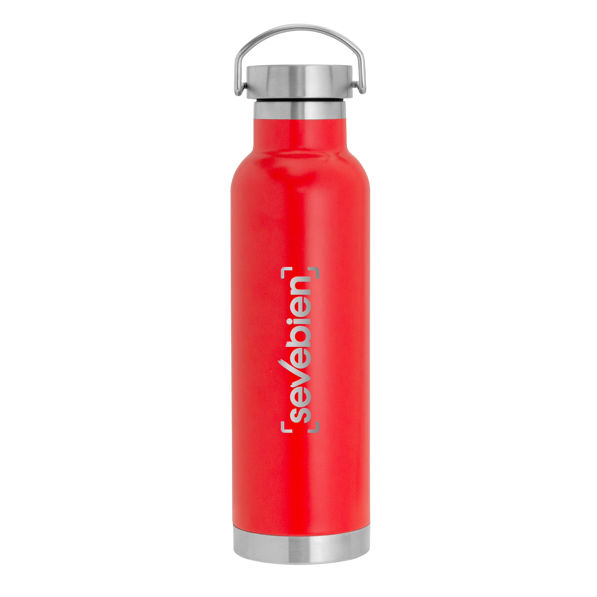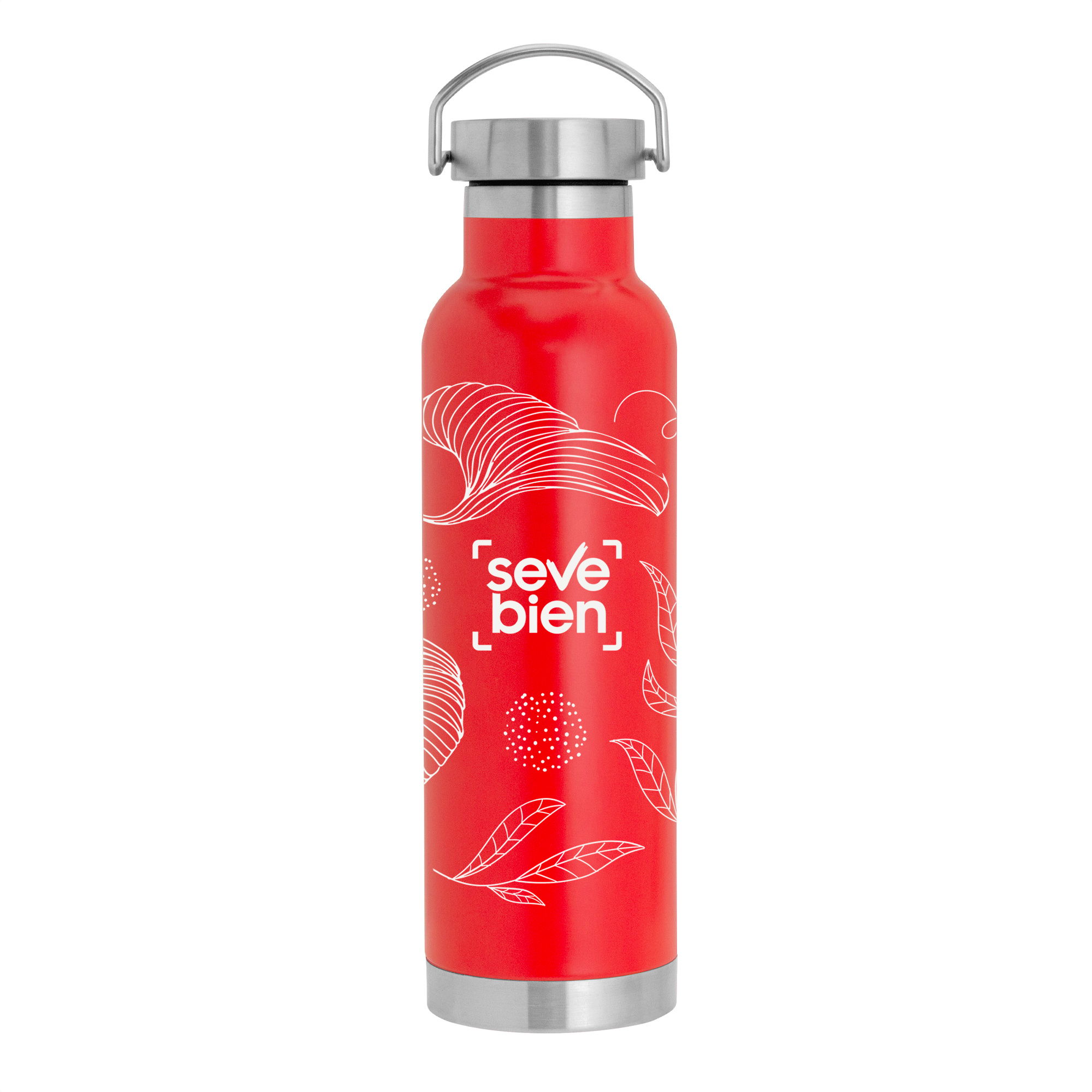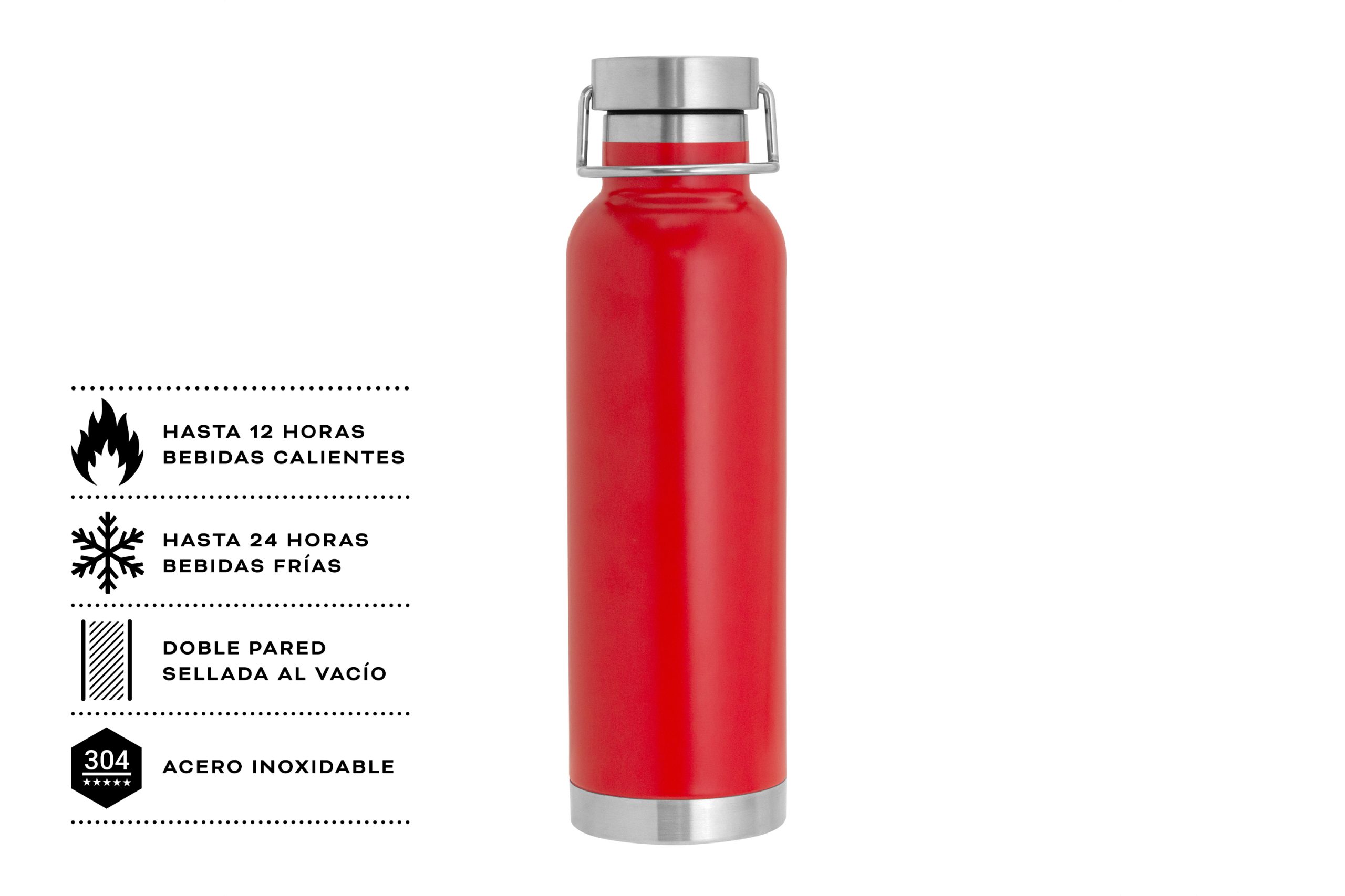 Ø 7,3 x 26 cm. Capacidad 650 ml. Acero inoxidable. Botella doble pared, sellada al vacío. Interior en acero 304 y exterior en acero 201. Tapa de acero a rosca con manija rebatible metálica . La medida de este termo es tan practica que con el tendras el liquido necesario para estar hidratado en el momento del día que elijas. Mantiene hasta 12 hs la temperatura de las bebidas calientes y hasta 24 hs la de las bebidas frías. Presentación en caja de regalo.