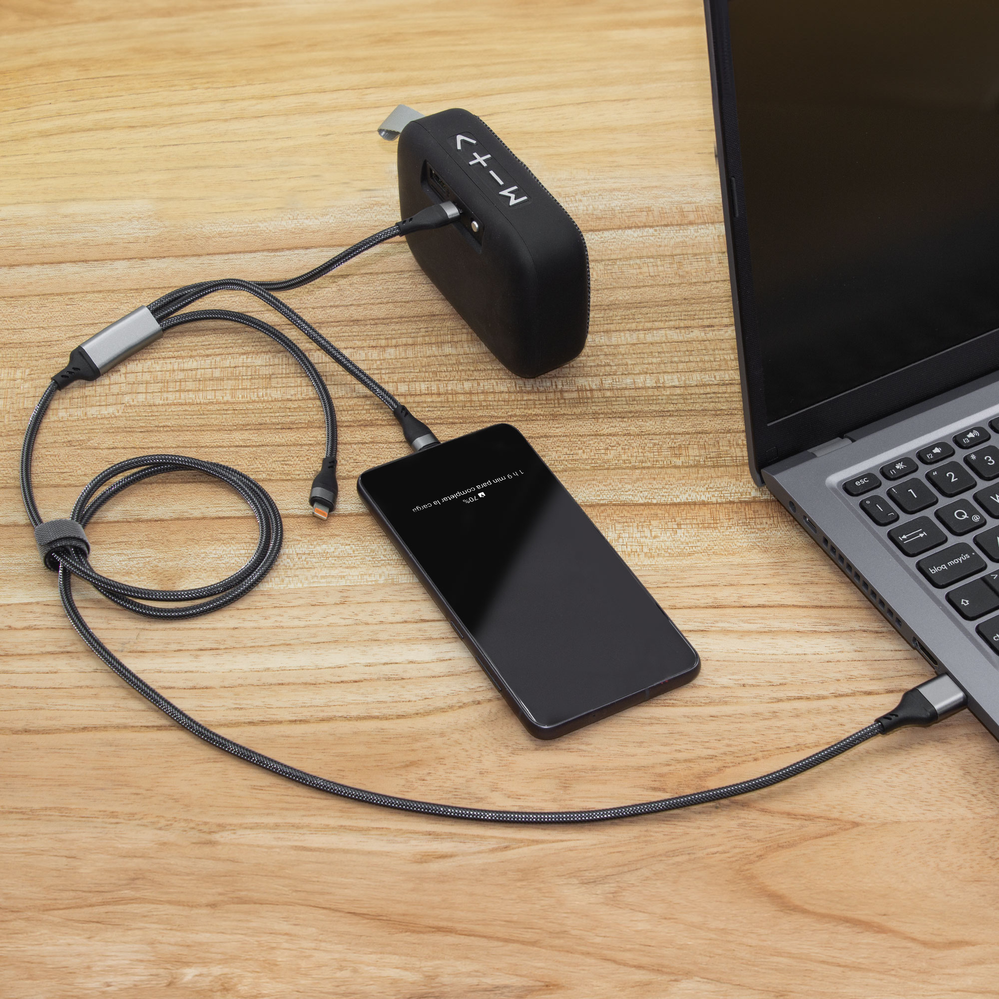 Cable de carga rápida. Entrada 2 en 1: USB y USB-C. Salida:  USB-C, microUSB y lightning. Max 20V 3A. Color gun con toques naranjas en cada conector. Precinto de velcro fijada al cable.