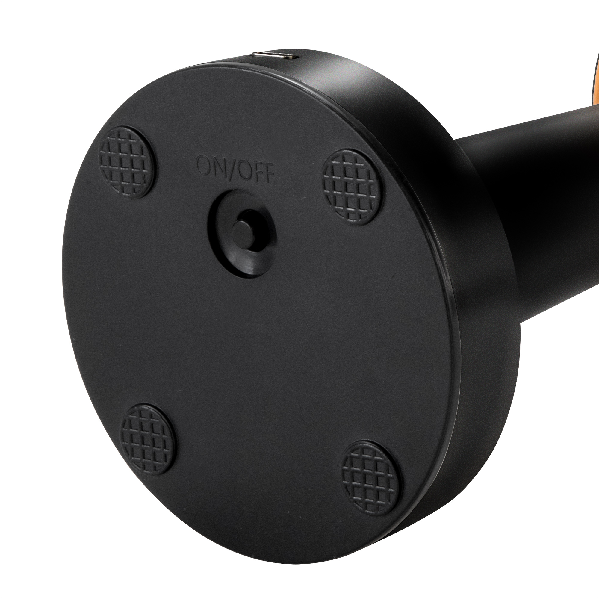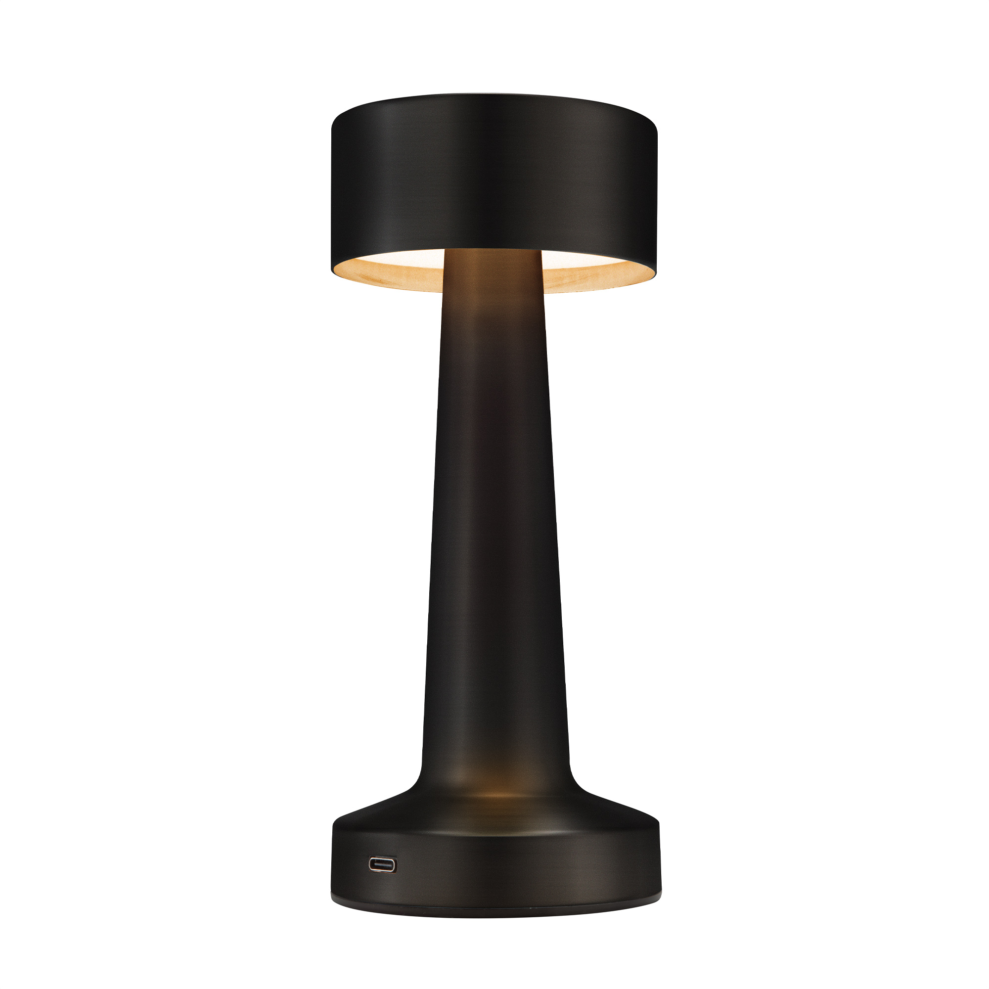 Lámpara. Luz led. Botón táctil de encendido/apagado que regula la intensidad y cambia tres modos de luz (cálida, blanca y blanca cálida). Pintura con acabado mate (color negro) y con acabado brillante (plata y cobre). Batería de litio recargable. Conexión USB-C. Incluye cable de carga color negro.