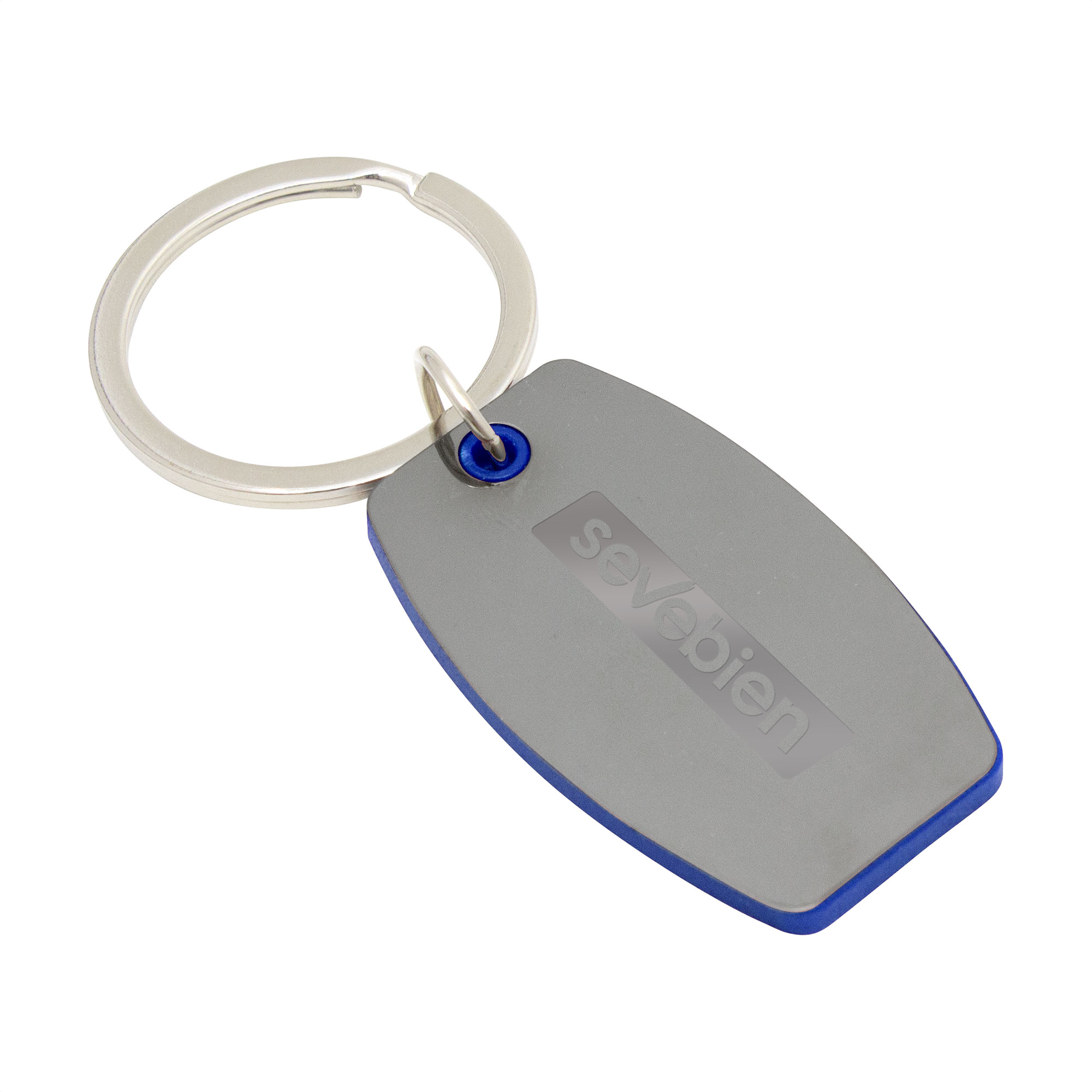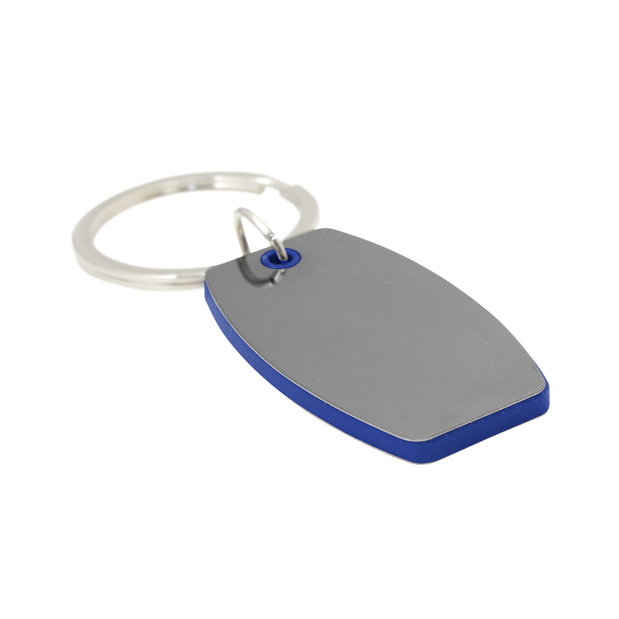 Llavero con forma ovalada. Estructura plástica de color con apliques de acero color gris gun de cada lado. Acabado brillante.