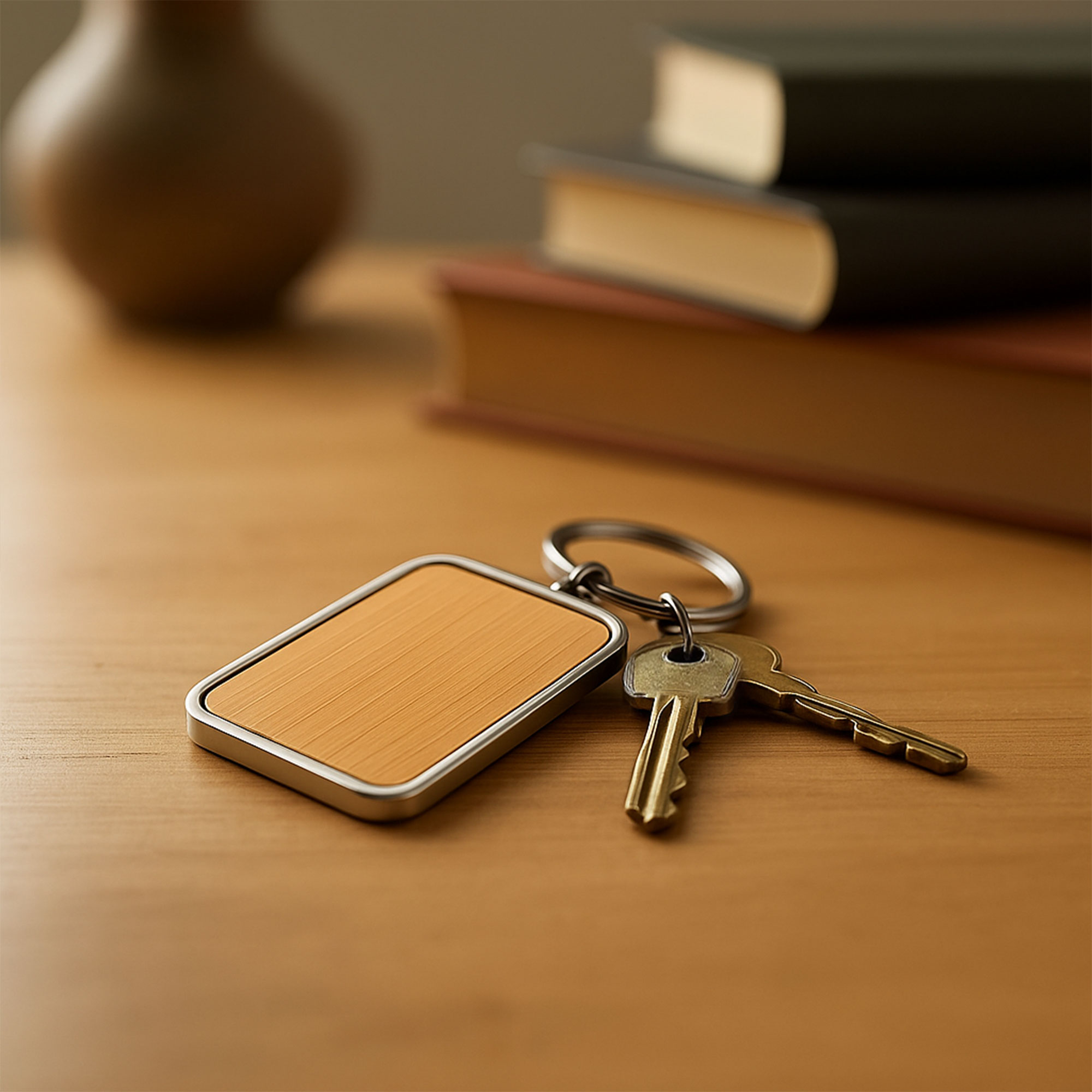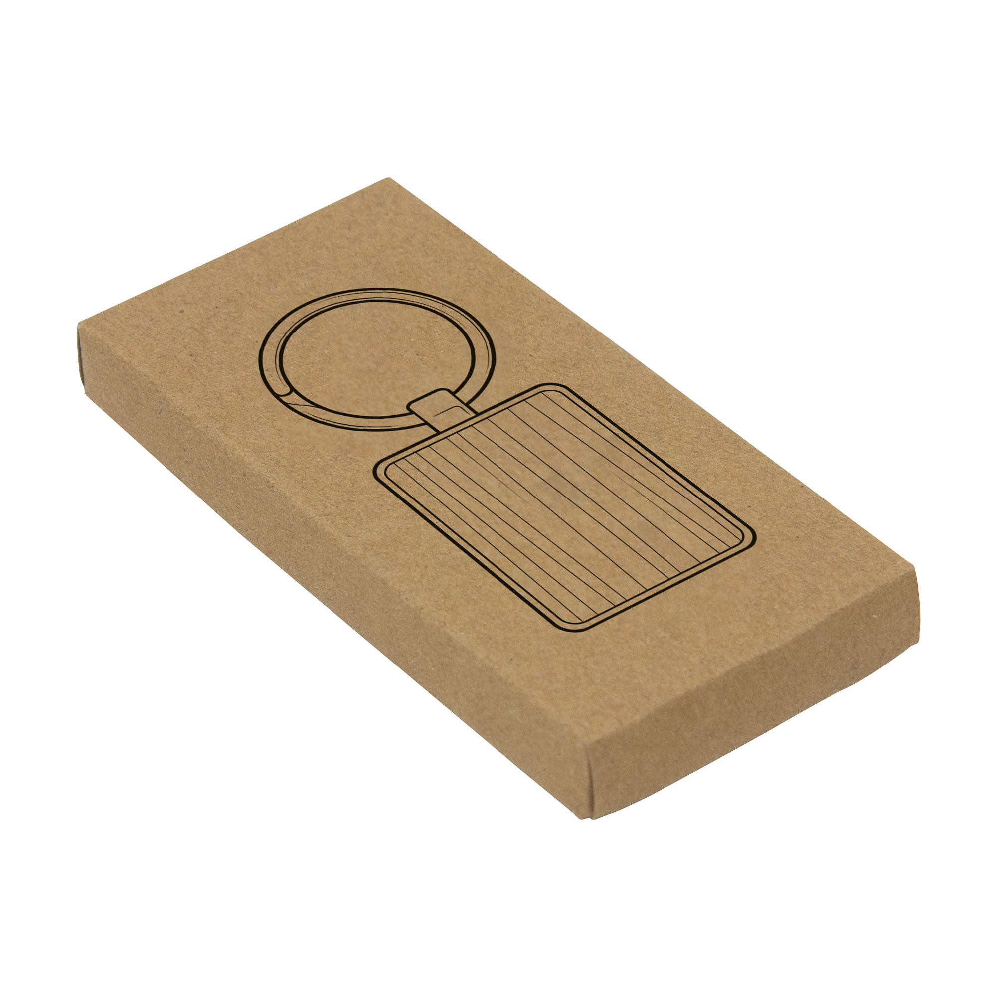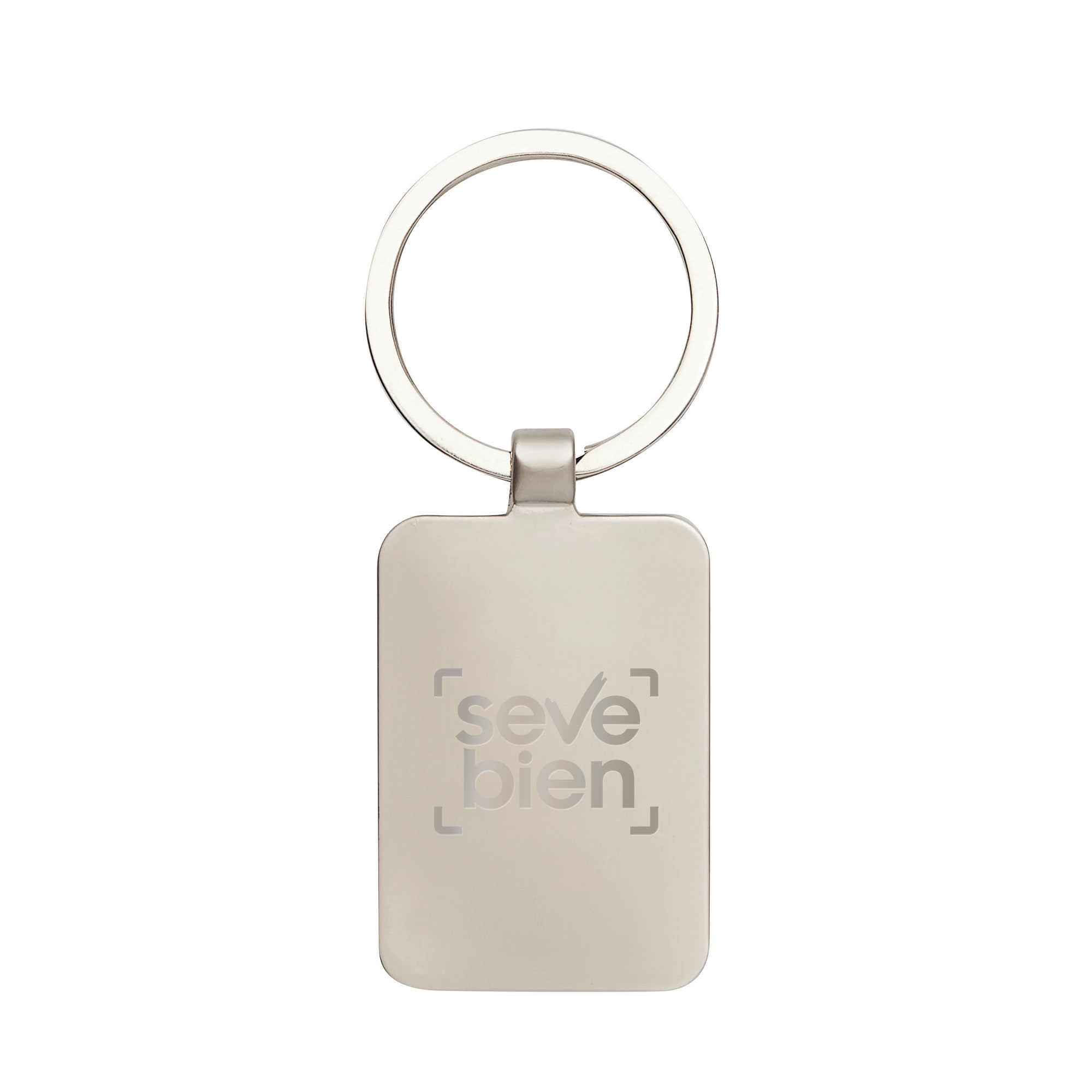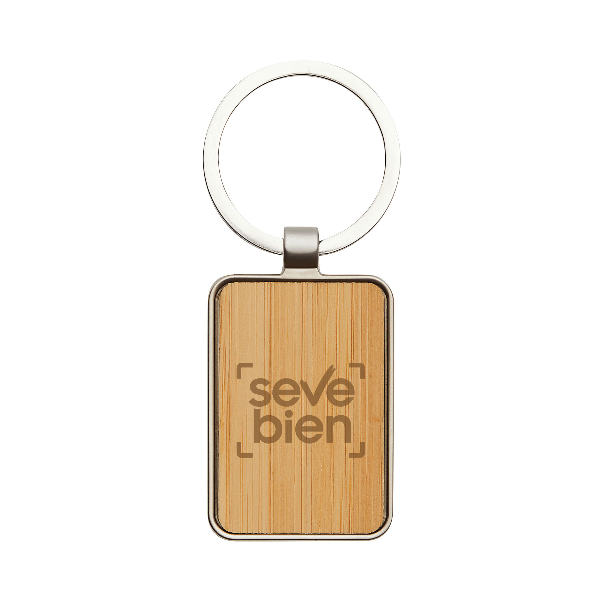 Llavero con forma rectangular. Estructura metálica con aleación de zinc con acabado brillante y panel frontal de bambú barnizado.