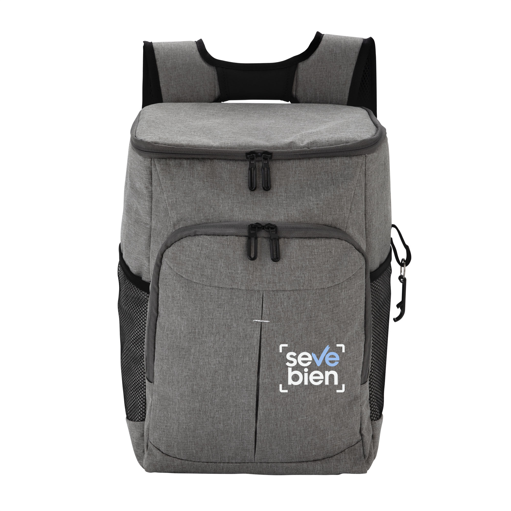 Mochila cooler. Compartimento principal con cierre en la parte superior. Compartimento frontal con cierre. Dos bolsillos laterales de red multipropósito. Incluye llavero destapador de botellas de aluminio (5,5 x 1,1 cm) extraíble. Correas regulables acolchadas y reforzadas. Cierres metálicos. Tiradores de cierre metálicos de color negro.