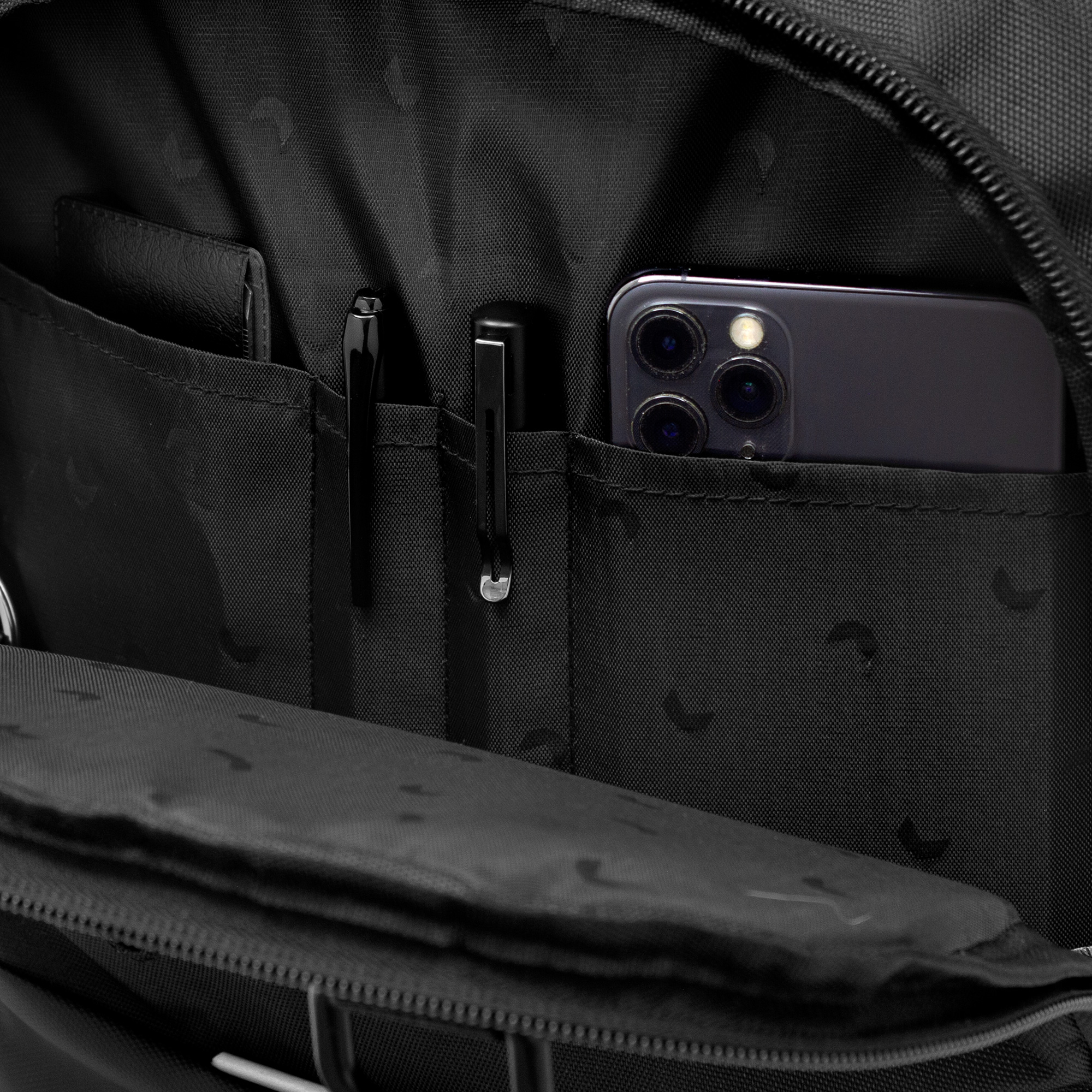 Mochila portanotebook de hasta 16 pulgadas.  Cuenta con tres compartimentos: Compartimento posterior con bolsillo acolchado portanotebook con cierre de velcro y bolsillo plano. Amplio compartimento principal con bolsillo externo con cierre horizontal afelpado portagafas. Compartimento frontal con múltiples bolsillos para accesorios y mosquetón plástico portallaves en su interior, exterior con detalle en poliuretano y ribete reflectante, cierre impermeable vertical y gancho porta accesorios. Dos bolsillos laterales portabotellas o accesorios. Asa superior reforzada. Correas ajustables y respaldo acolchados. Tira para sujetar la mochila en la manija extensible de un equipaje de mano. Tiradores de cierres metálicos.