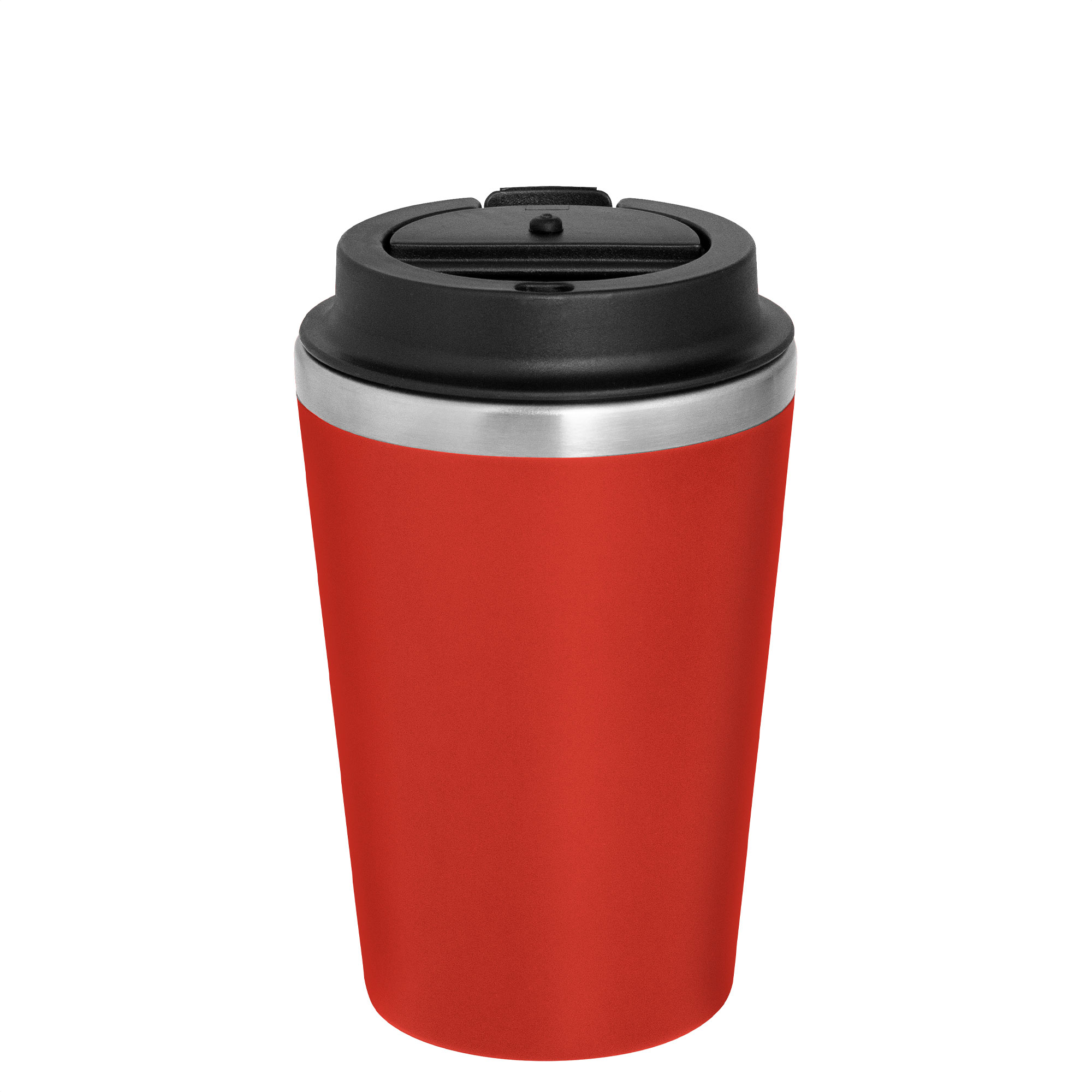Mug doble pared. Interior de acero inoxidable 304 y exterior de polipropileno con acabado mate. Tapa de polipropileno con anillo de silicona y seguro antiderrame. Base antideslizante.