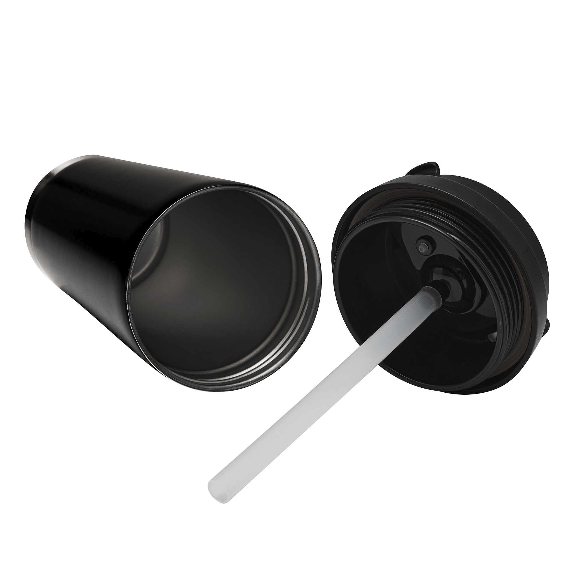 Mug doble pared, sellado al vacío. Interior en acero 304 y exterior en acero 201. Tapa de polipropileno a rosca y anillo de silicona, 2 en 1, con bombilla de polietileno incorporada, seguro antiderrame a presión y correa de poliéster. Tapa y correa del mismo color que el vaso. Pintura con acabado mate, textura suave al tacto. Base en acero 201. Mantiene hasta 12 hs la temperatura de las bebidas calientes y 24 hs de las bebidas frías.
