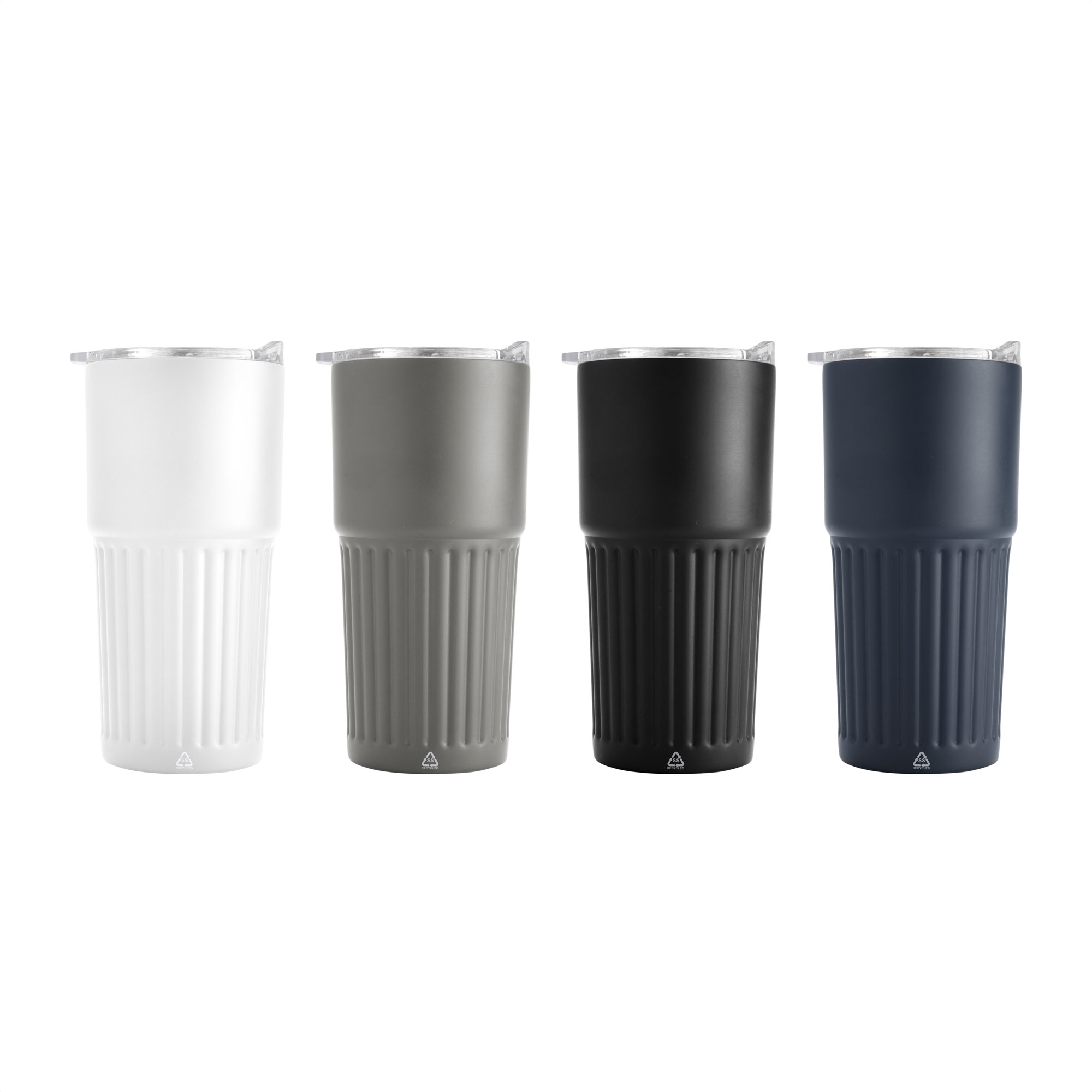 Mug doble pared, sellado al vacío. Mug con aislamiento térmico. Tecnología vacuum. Interior en acero 304 reciclado y exterior en acero 201. Tapa de poliestireno con anillo de silicona. Pintura acabado semi mate. Parte inferior texturada para un mejor agarre. Base antideslizante. Mantiene hasta 8 hs la temperatura de las bebidas calientes y hasta 12 hs la de las bebidas frías.