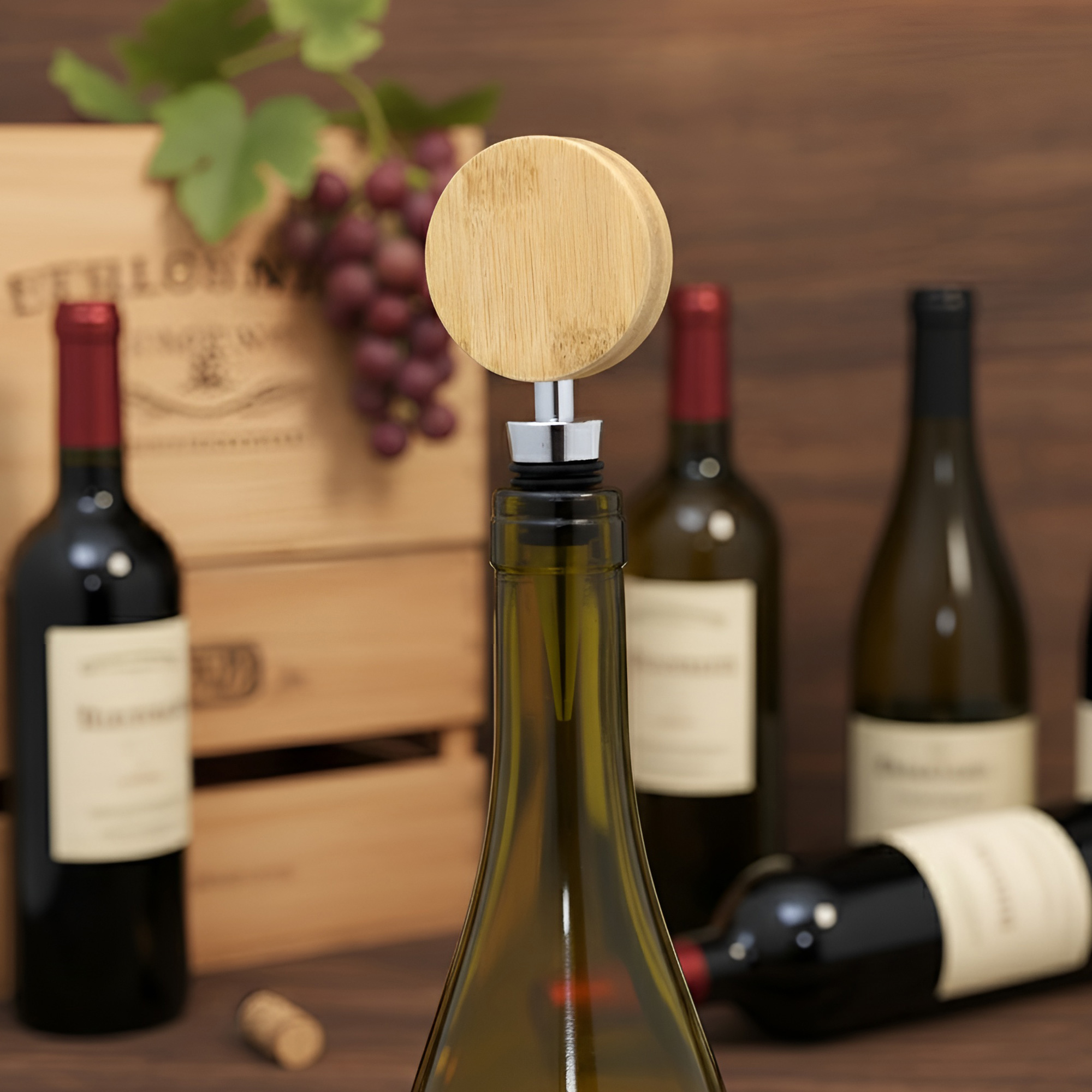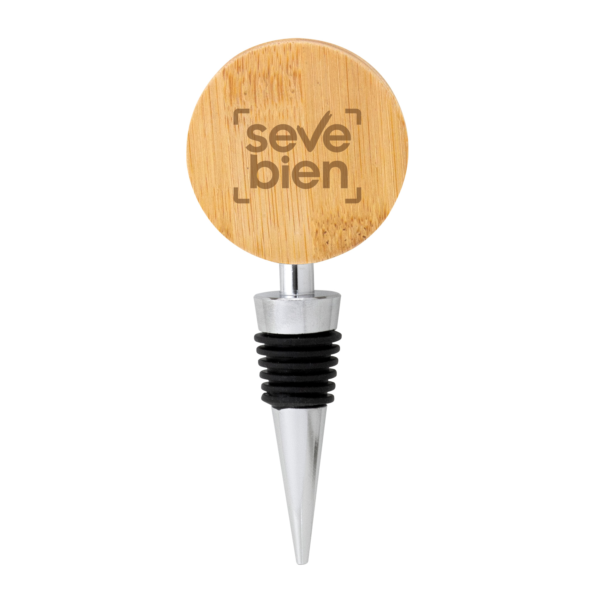 Tapón para botellas con destapador. Estructura circular de bambú y acero para el destapador y estructura cónica de aleación de zinc y silicona para el tapón.