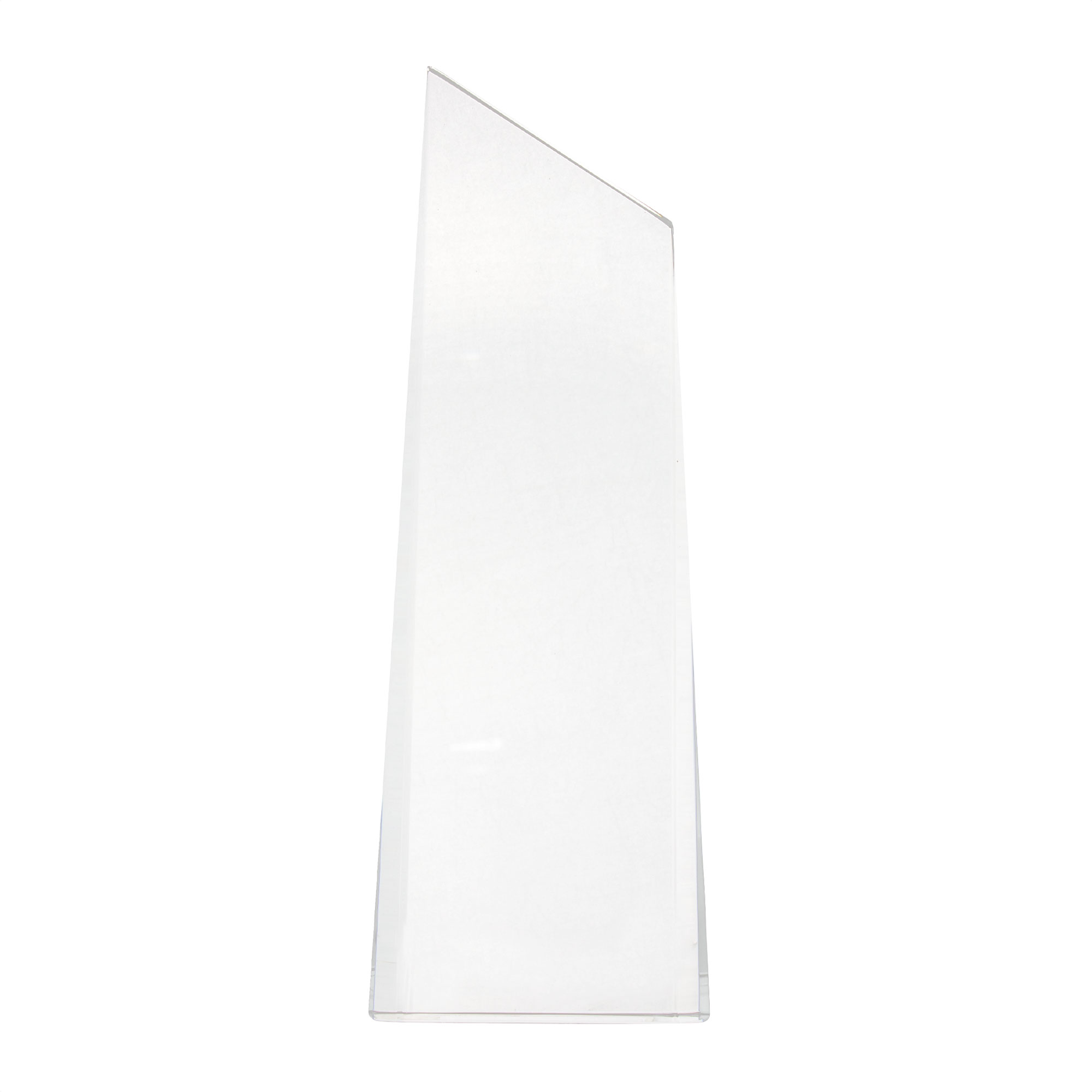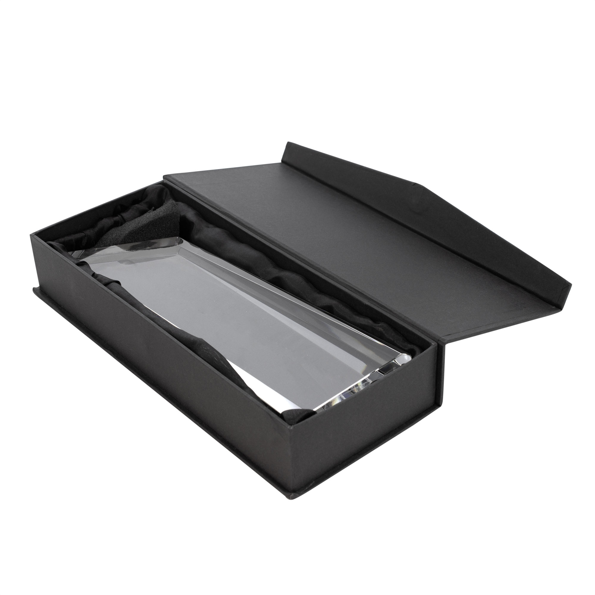 Trofeo de vidrio simil cristal. Presentación en estuche con cierre magnético y envoltorio de papel blanco.